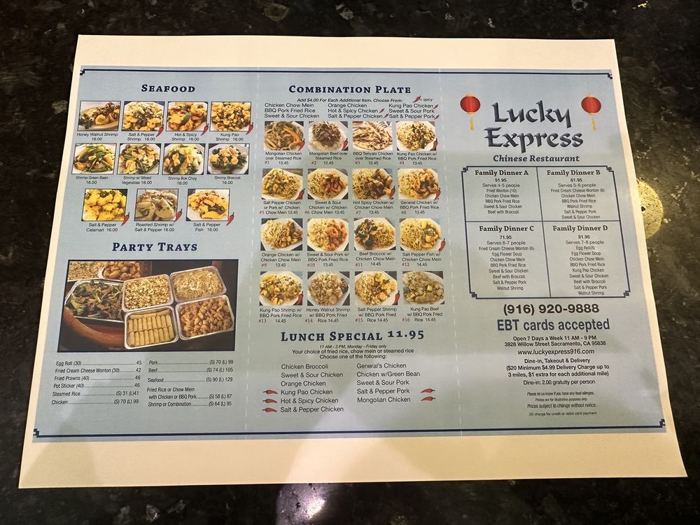 Introducing Lucky Express, a Chinese restaurant located in Sacramento, CA. The restaurant offers a variety of options including vegetarian dishes and happy hour specials. The menu features dishes like sweet and sour chicken, orange chicken, and thick noodles. Customers have praised the generous portions and fresh, flavorful food. The atmosphere is clean and welcoming, with spacious seating and friendly service. Despite a minor oversight in an order, the overall experience at Lucky Express is positive. With reasonable pricing and quick service, this hidden gem is a must-try for multicultural clientele. Enjoy your meal at Lucky Express with the convenience of takeout or delivery options. Explore the menu and indulge in delicious Chinese cuisine at this longstanding establishment. Try Lucky Express for a satisfying dining experience.